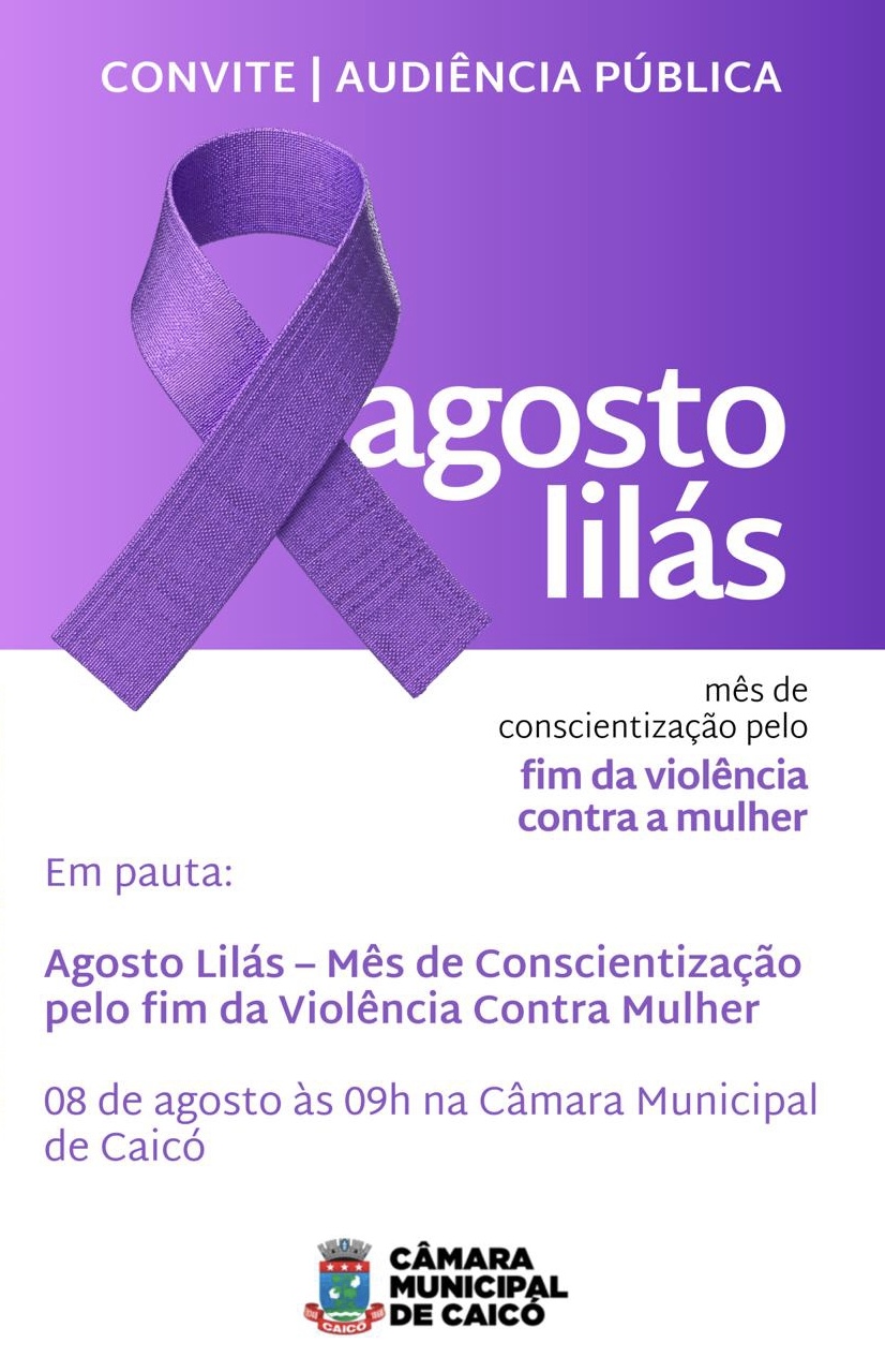 Nesta quinta-feira (8), a partir das 9h, a Câmara de Vereadores de Caicó será palco de uma importante audiência pública dedicada ao Agosto Lilás: Mês de conscientização e combate à violência contra a mulher