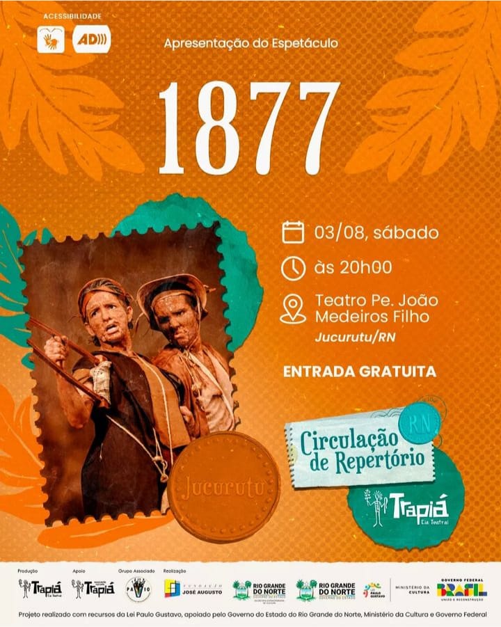 A noite, às 20h, o Teatro de Jucurutu apresenta “1877”, um espetáculo vencedor de 07 prêmios no Festival Nacional de Teatro, deste ano, no Piauí. A peça fala sobre a seca de 1877, a coragem e a resiliência do povo nordestino.