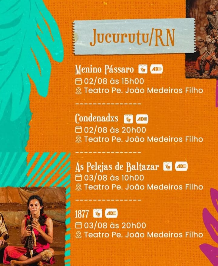 Em Jucurutu, RN, a programação cultural inicia nesta sexta-feira, 02 de agosto, com apresentação do espetáculo Menino Pássaro, às 15h, e Condenadxs, às 20h, no Teatro Pe. João Medeiros Filho. Menino Pássaro traz um menino solitário e um pássaro colorido, que ensina ao menino sobre a construção do vínculo de amizade, através da empatia e respeito a liberdade. Na peça Condenadxs, adolescentes encontram-se num cenário sertanejo e dialogam sobre adversidades vividas e a esperança de alcançar sonhos.
