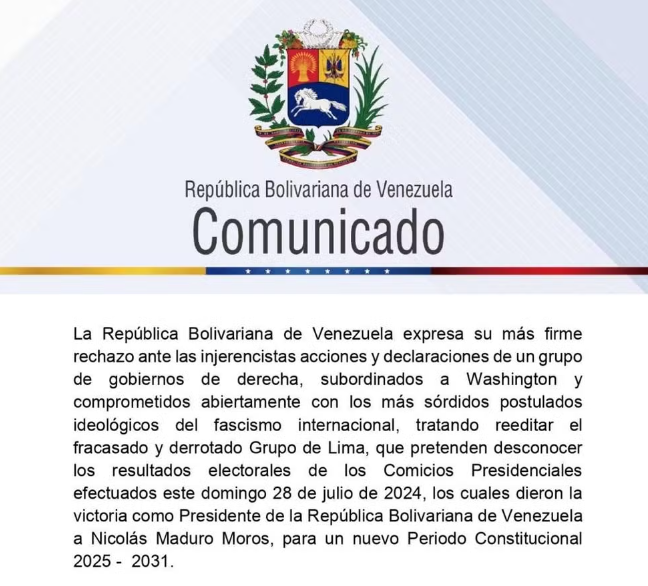 A carta com a expulsão foi publicada pelo ministro das Relações Exteriores venezuelano, Yván Gil Pinto. Ele diz que o país “rejeita as ações e declarações de um grupo de governos de direita, subordinados a Washington e comprometidos abertamente com ideologias sórdidas do fascismo internacional” e que este grupo quer desconhecer o resultado da eleição realizada no domingo (28).