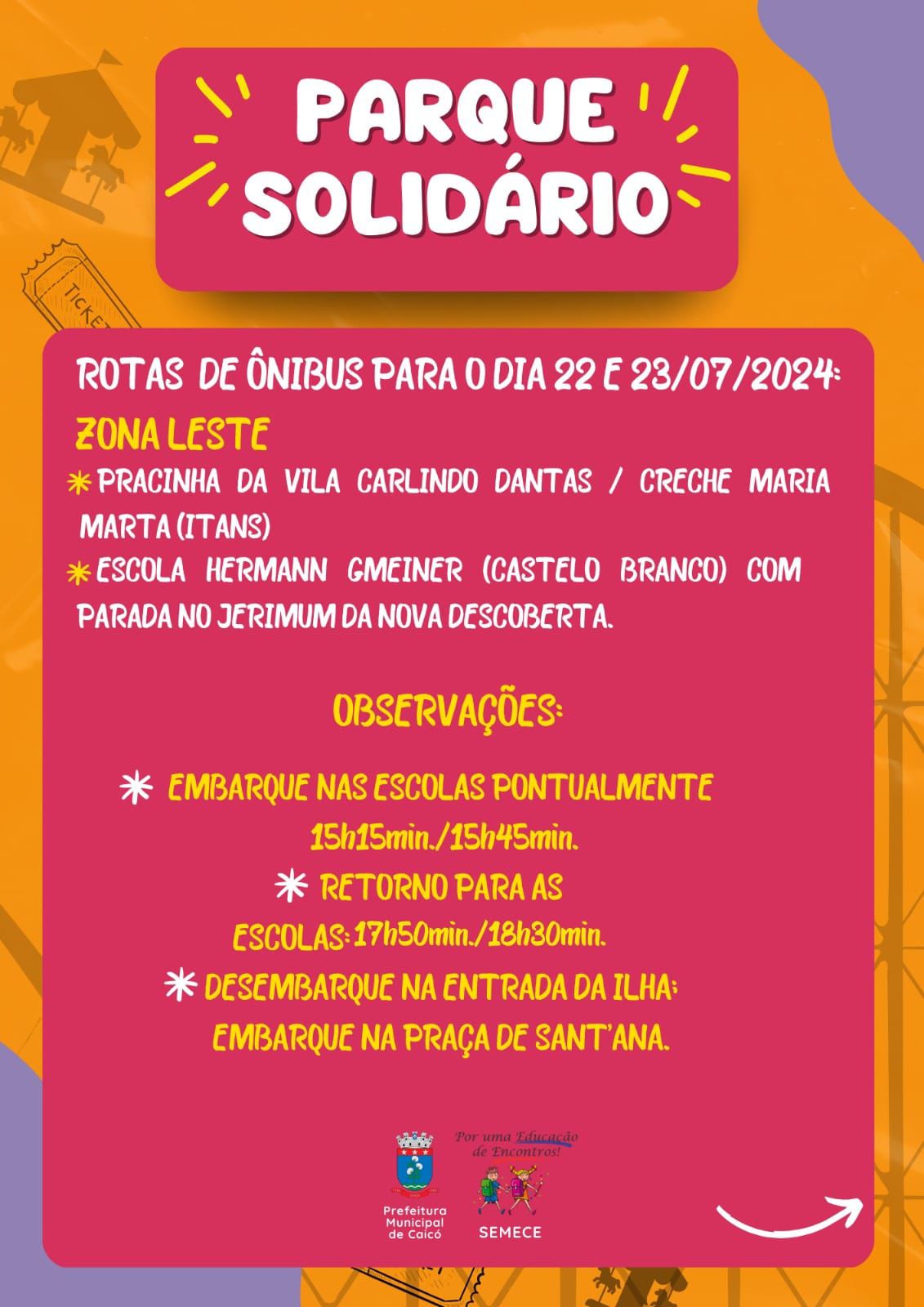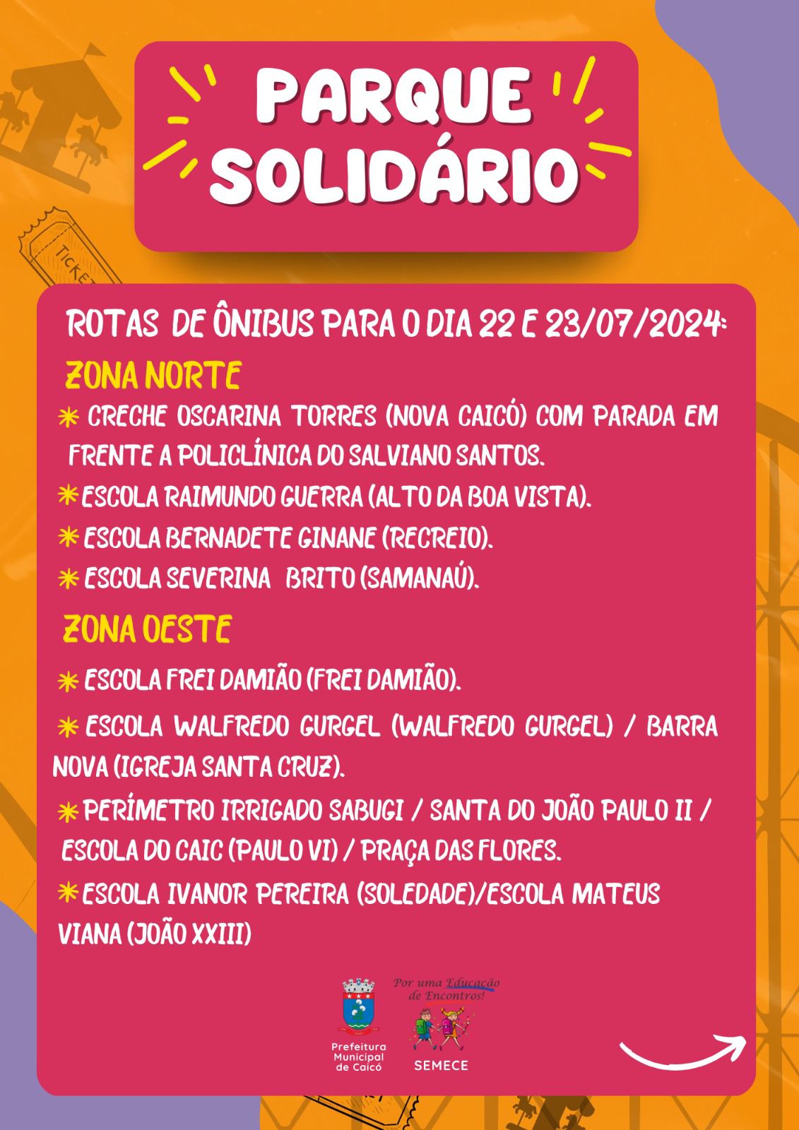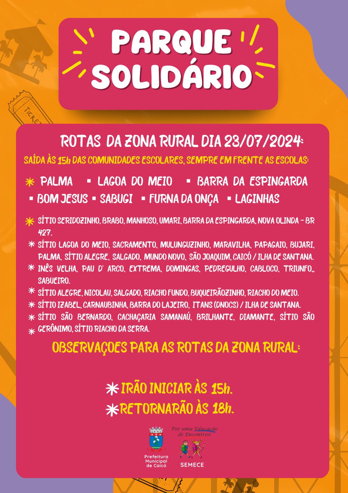A Secretaria de Educação de Caicó (RN) definiu as rotas para os transportes que levarão as crianças dos bairros da cidade e da zona rural para os parques de diversão no Complexo Turístico Ilha de Sant’Ana, nos dias 22 e 23 de julho. Elas poderão brincar nos parques gratuitamente. Os participantes poderão desfrutar de carrossel, roda-gigante, entre outras atividades.