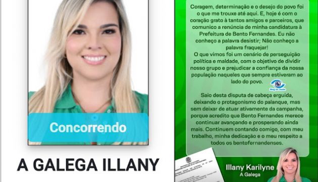 A candidata à prefeitura de Bento Fernandes, Galega Illany, renunciou sua candidatura em pleno início da campanha eleitoral.