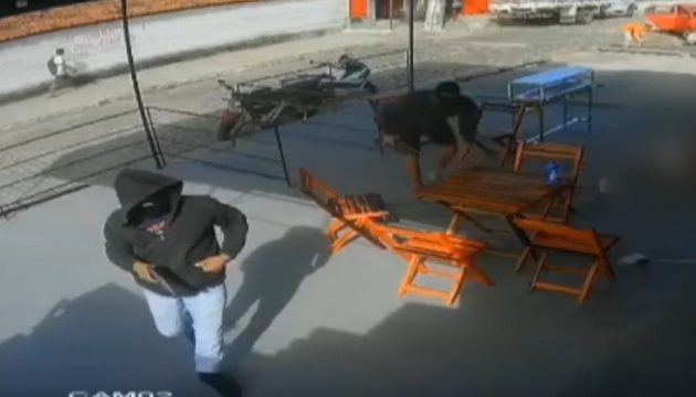 Segundo a Polícia Civil, os dois suspeitos forçaram a área da estrutura que estava conectada com a parede e arrancaram o portão. Eles fugiram em seguida.