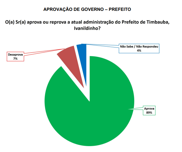 Conforme já citado, o prefeito Ivanildinho é aprovado por 89% dos eleitores de Timbaúba dos Batistas e desaprovado por 7%.