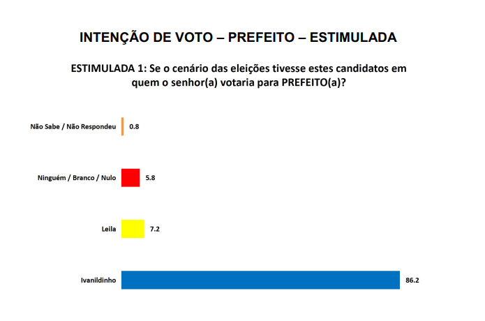 Na estimulada, agora apresentando os candidatos aos entrevistados, a diferença se mantém em patamar semelhante – o prefeito Ivanildinho tem 86,2% contra 7,2% de Leila. Ninguém, branco e nulo somam 5,8% e não sabe ou não respondeu 0,8%.