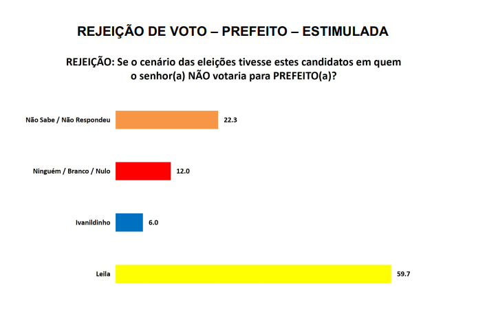 Por fim, no item rejeição os dados foram os seguintes – 59,7% alegaram que não votariam de forma alguma na candidata Leila e apenas 6,0% rejeitaram o nome de Ivanildinho. Ninguém, branco e nulo chegaram a 12% e não sabe ou não responderam 22,3%.