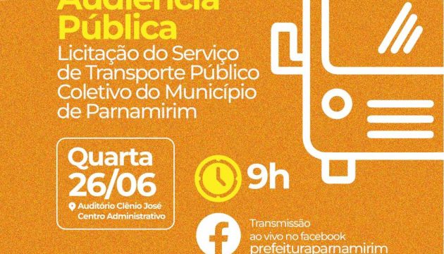 A audiência será presencial, coordenada pela @sesdem.parnamirim em parceria com a FUNPEC, transmitida ao vivo via Facebook da Prefeitura para discutir o futuro do transporte público coletivo municipal. Aberta a todos os cidadãos e entidades interessadas, a audiência terá como pauta três temas: