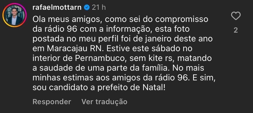 Pelo Instagram, em comentário de postagem jornalística, o ex-deputado Rafael Motta negou também as especulações que o vinculavam ao cargo de vice de Carlos Eduardo. “Sigo pré-candidato a prefeito”, disse Motta, finalmente, respondendo a imprensa potiguar sobre o assunto.