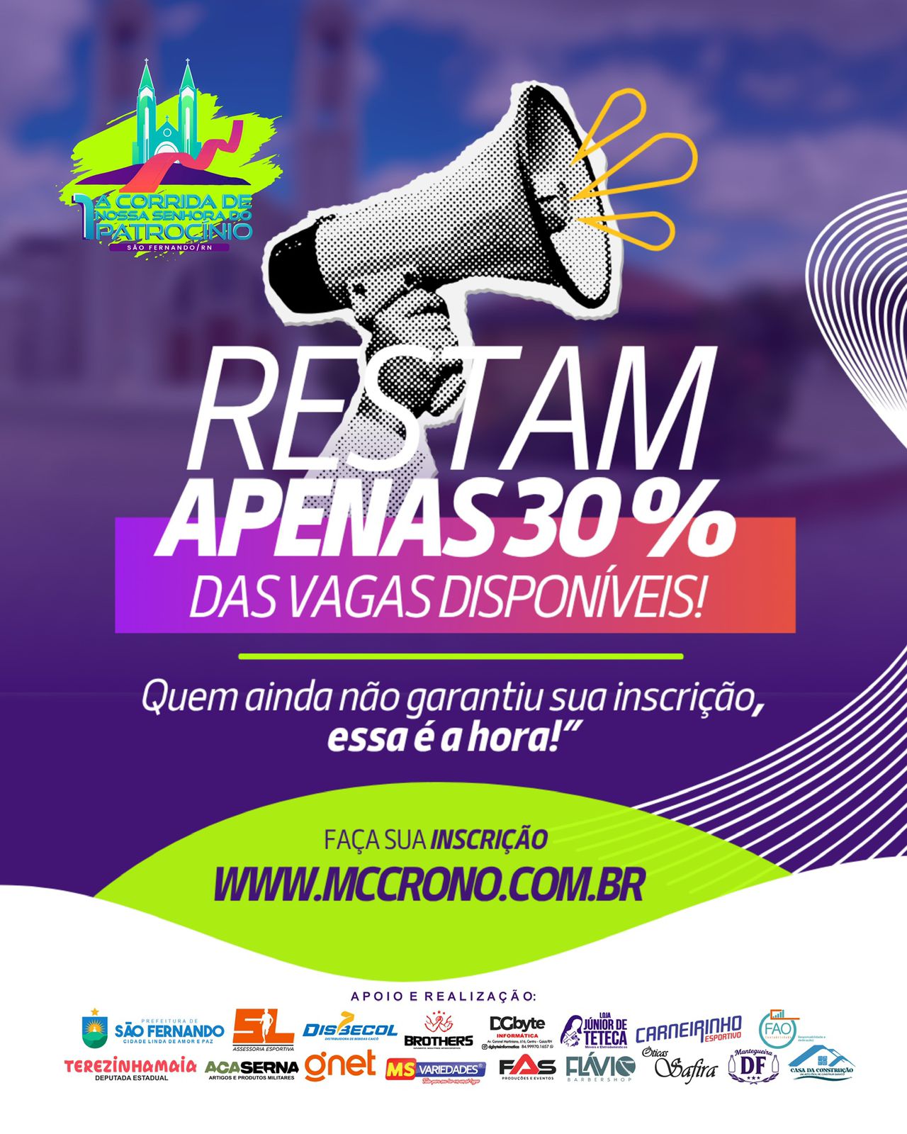 Com inscrições abertas há poucos dias, restam apenas 30% das vagas disponíveis, demonstrando o sucesso e a grande adesão da comunidade. A corrida é uma realização do Governo Municipal de São Fernando, por meio da Secretaria Municipal de Esportes e Turismo, e integra a programação da festa da padroeira Nossa Senhora do Patrocínio.