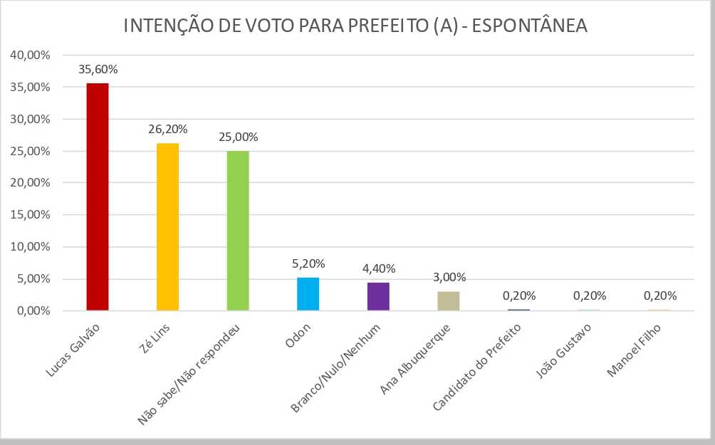 No cenário ESPONTÂNEO, 35,60% dos entrevistados demonstraram interesse pelo pré-candidato Lucas Galvão, seguido de Zé Lins, que obteve 26,20%, seguidos de Odon Júnior (não é candidato) e da pré-candidata Ana Albuquerque. Confira a seguir o quadro com os dados do levantamento.