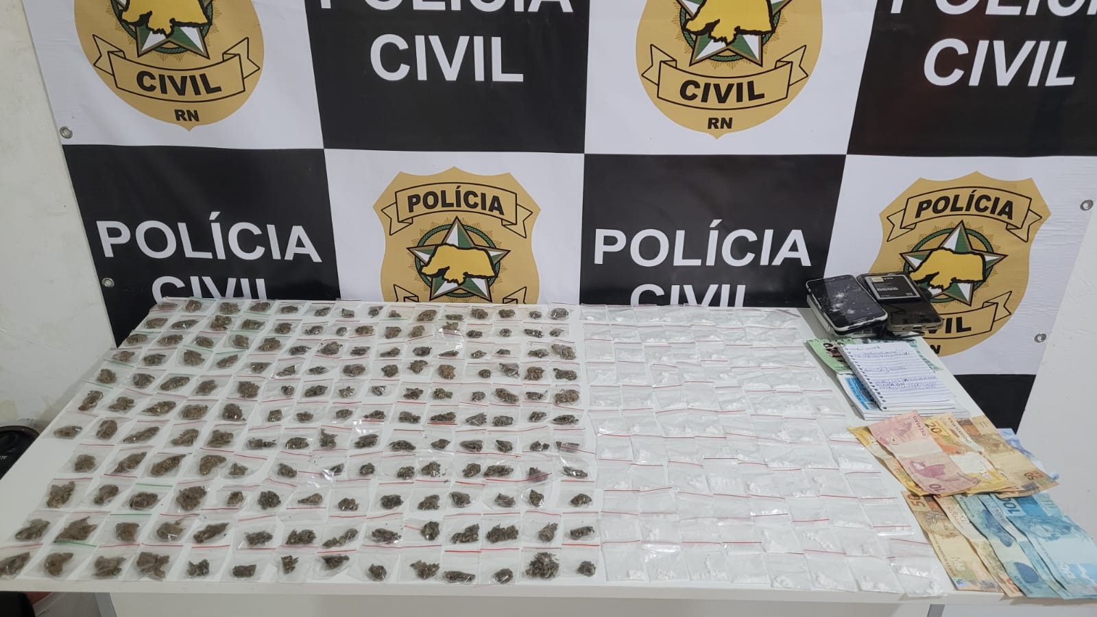 Durante as diligências, os investigadores encontraram com o suspeito 161 trouxinhas de maconha, 90 papelotes de cocaína, além de cadernetas com anotações relacionadas ao comércio ilegal, sacos zip-lock e a quantia de R$ 712,00 em espécie.