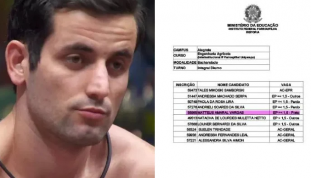 O ex-BBB Matteus do Alegrete, vice-campeão do BBB 24, se autodeclarou preto para o ingresso no curso de Engenharia Agrícola. A informação consta no Edital nº 046/2014 e foi confirmada pelo Instituto Federal Farroupilha (IFFar) nesta sexta-feira (14).
