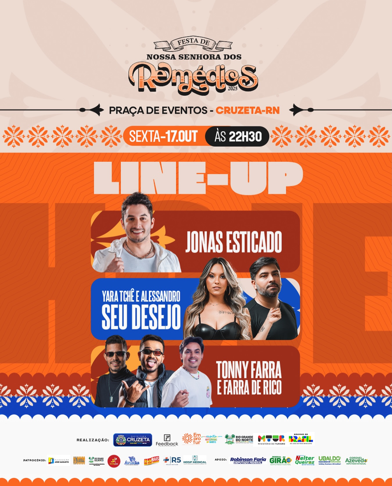 As atrações da noite já estão prontas para agitar o público. A dupla Yara Tchê & Alessandro Seu Desejo chegou a Caicó nas primeiras horas do dia e segue logo mais à noite para Cruzeta, onde promete um show marcante. A programação começa às 22h30 com o cantor Jonas Esticado, e a festa continua madrugada adentro com Tonny Farra e Farra de Rico, garantindo animação até o amanhecer.