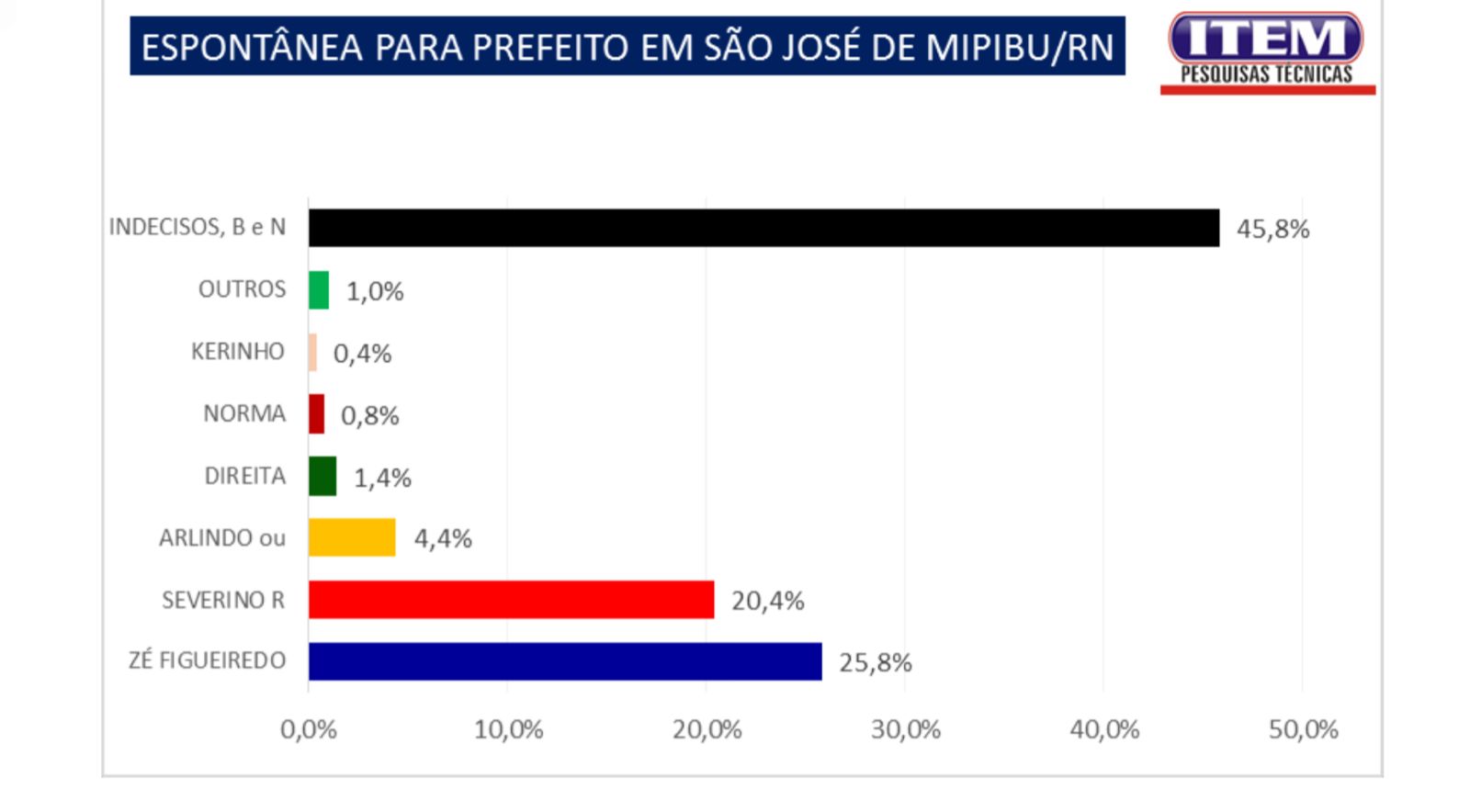Espontaneamente, sem qualquer tipo de sugestão dos entrevistadores, o prefeito Zé Figueiredo também lidera, ficando com 25,8% das intenções de votos. O segundo lugar recebeu 20,4% das citações. Eleitores indecisos, que declararam votar em branco e que pretendem anular o voto atingem os 45,8%.
