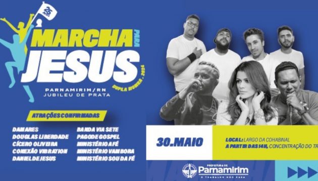 A Prefeitura de Parnamirim, por meio das secretarias de Turismo e Desenvolvimento Econômico (Setude) e de Cultura (Semuc), convida toda a comunidade para a 25ª edição da Marcha para Jesus, um dos eventos mais importantes para a comunidade evangélica da cidade. O evento ocorrerá no dia 30 de maio, a partir das 14h, no Largo da Cohabinal.