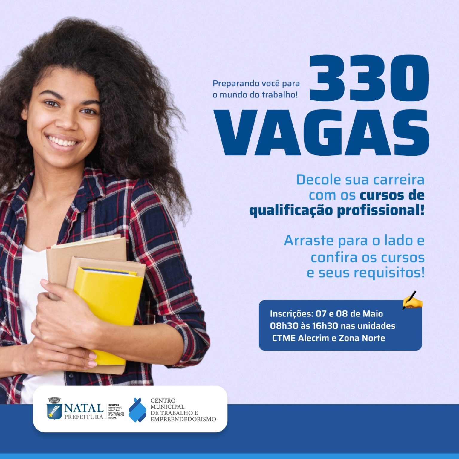 A Prefeitura do Natal, por meio da Secretaria Municipal do Trabalho e Assistência Social (Semtas), abre as inscrições para 330 vagas em cursos de qualificação profissional. A iniciativa tem o objetivo de oferecer oportunidades de desenvolvimento para aprimorar habilidades da população e ampliar chances no mercado de trabalho.