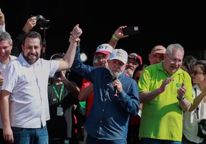 Durante o discurso às centrais sindicais, Lula chamou Boulos ao seu lado, fez elogios ao aliado e pediu que o público votasse nele na eleição municipal de outubro. O presidente afirmou que o deputado vai enfrentar “três adversários” no pleito: o ex-presidente Jair Bolsonaro (PL), o governador Tarcísio de Freitas (Republicanos) e o prefeito Ricardo Nunes (MDB).