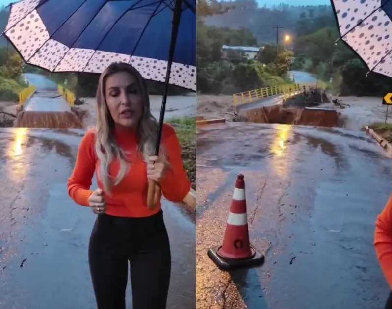 Ela segue falando sobre outros problemas provocados pelas chuvas, como obstrução de bueiros e deslizamentos de terra, e pede à população que se proteja. Em seguida, a ponte é arrastada pela correnteza.