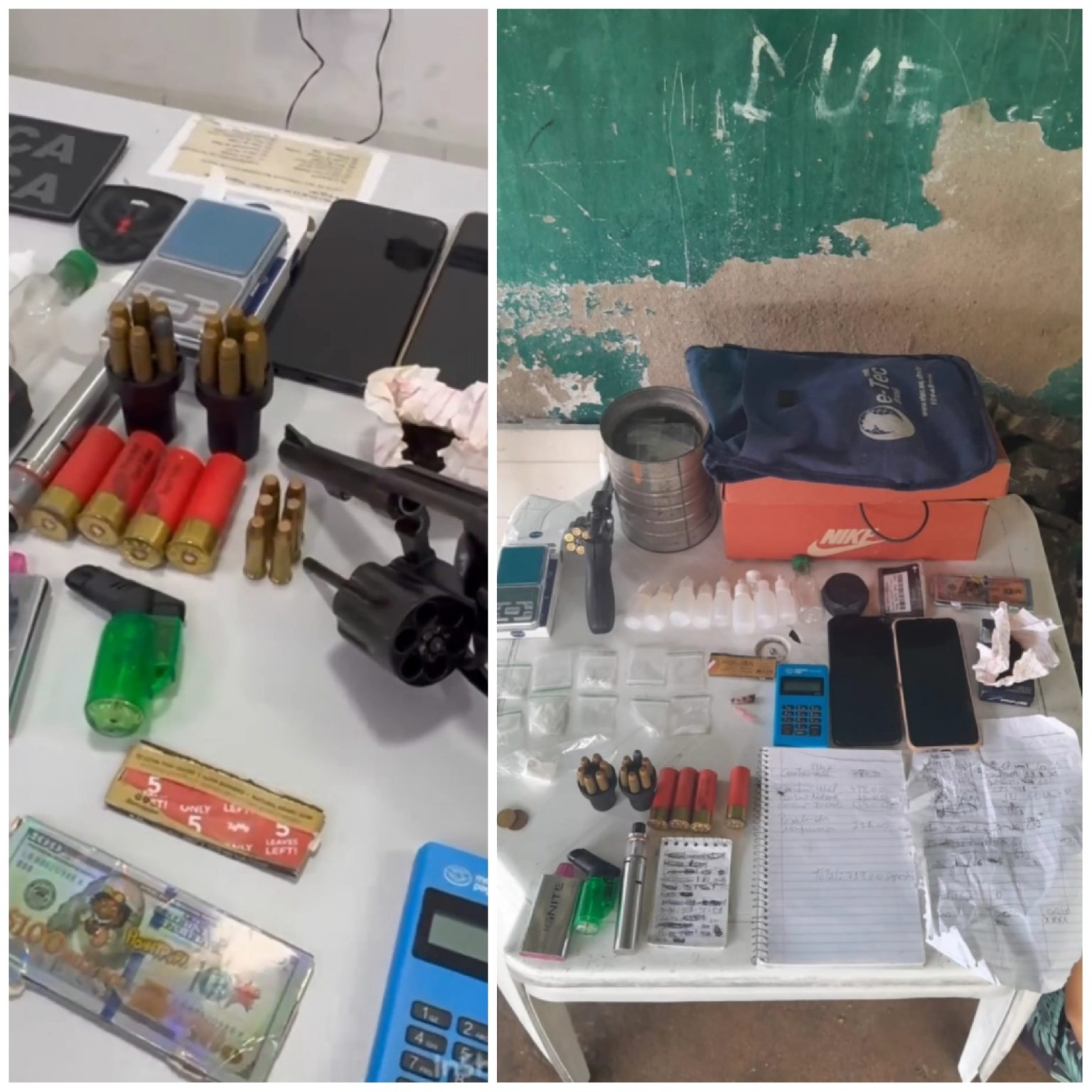 Durante a abordagem, os policiais encontraram em posse dos suspeitos: arma de fogo, porções de drogas, balança de precisão e cadernos de anotação. Os homens e todo material foram conduzidos à delegacia.