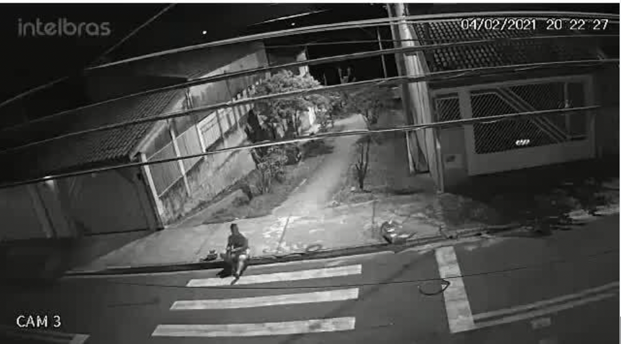 A câmera de segurança registrou o momento em que a dupla aborda a pedestre. Na calçada, a vítima ergue as mãos após o anúncio do assalto e ouve do garupa a fala para entregar o celular.