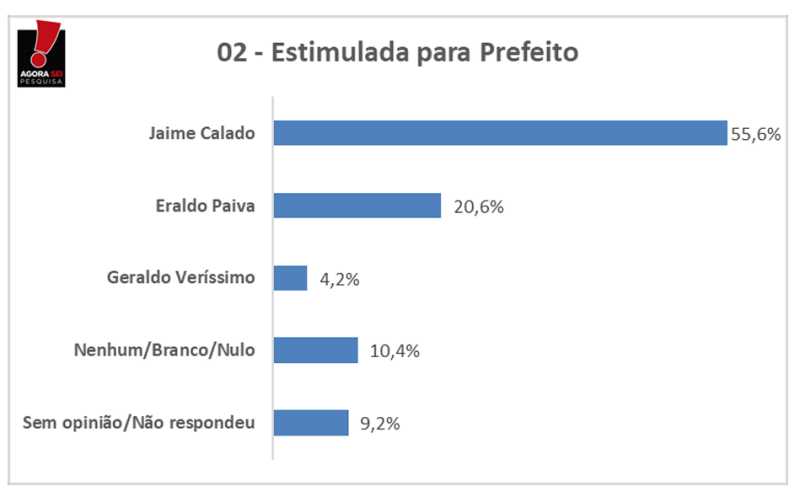 No primeiro cenário estimulado, o ex-prefeito Jaime Calado lidera com 55,6% das intenções de voto, seguido pelo atual prefeito Eraldo Paiva com 20,6%, Geraldo Veríssimo tem 4,2%. Branco ou nulo 10,4% e 9,2% não responderam.