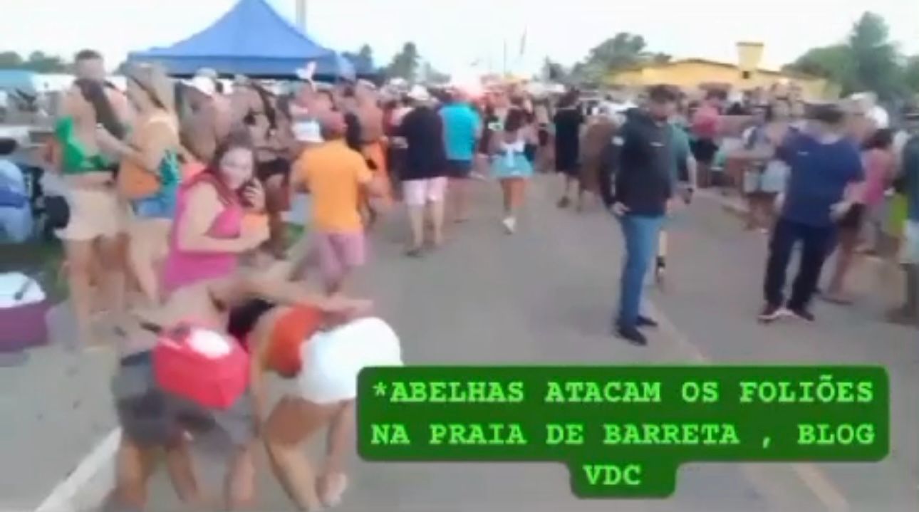 Nas imagens é possível perceber o momento em que os foliões que estão aproveitando trio começam a correr para escapar das abelhas. Alguns se abaixam e outros fogem em direção a área de mata da praia.