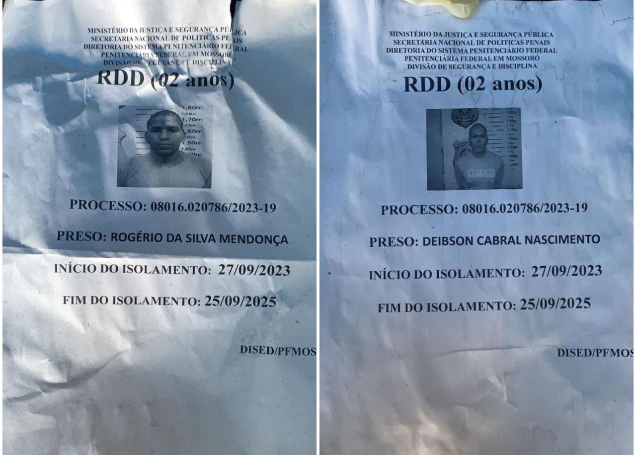 Dois detentos de alta periculosidade fugiram da Penitenciária Federal de Mossoró nesta quarta-feira (14). De acordo com informações, os fugitivos foram identificados como Deibson Cabral Nascimento e Rogério da Silva Mendonça, ambos oriundos do estado do Acre.
