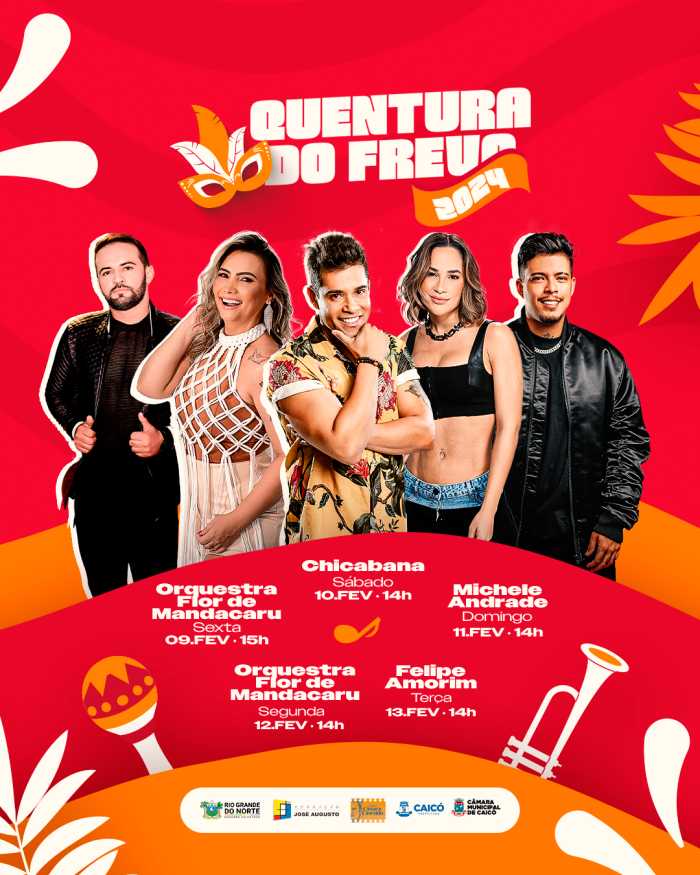 Sexta-feira (09/02): O agito começa com a Orquestra Flor de Mandacaru, trazendo o autêntico som do frevo para iniciar o Carnaval com muita energia. Saída do bloco às 15h, para dar início a folia de forma contagiante.