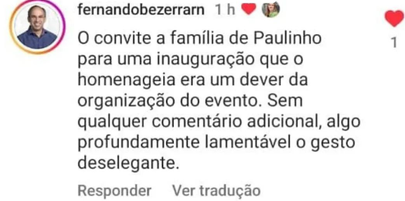 O prefeito da cidade de Acari, Fernando Bezerra, comentou nas Redes Sociais o fato do Prefeito de São Gonçalo do Amarante, Eraldo Paiva, em não ter convidado a família do ex-prefeito Paulinho Emídio (in memoriam) para inauguração de obra que recebe seu nome.