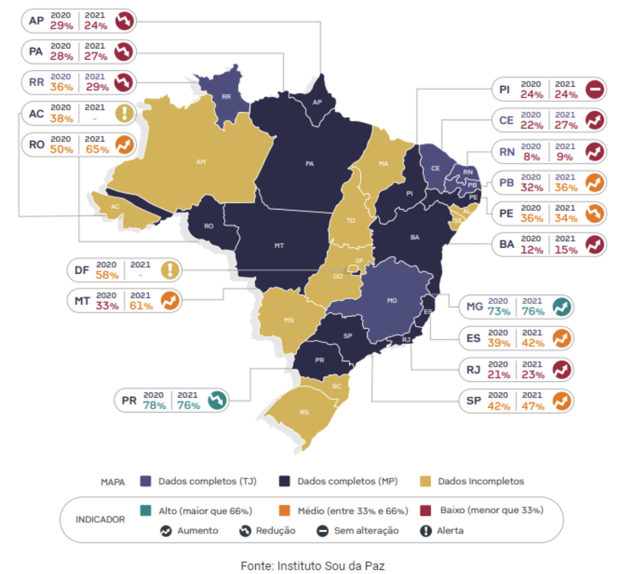 Segundo os dados, em 2021 o estado esclareceu 9% dos homicídios registados, e em 2020, apenas 8%. O Brasil piorou o esclarecimento de homicídios em 2020 e 2021. Apenas 35% , ou seja, 1 em cada 3, dos 40 mil homicídios dolosos no Brasil ocorridos em 2021 foram esclarecidos.