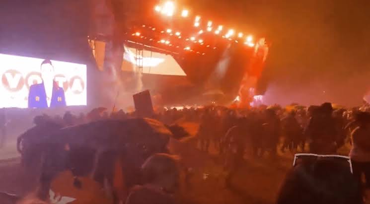 Imagens publicadas nas redes sociais mostram o momento em que as torres que eram a base de sustentação do cenário desabaram devido a um vendaval e um telão caiu no palco onde estavam Álvarez Máynez e outros candidatos do Movimento Cidadão.