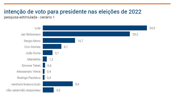Levantamento Paraná Pesquisas indica que o ex-presidente Luiz Inácio Lula da Silva (PT) lidera a corrida eleitoral ao Palácio do Planalto com 34,9% das intenções de voto. Em seguida, estão o presidente Jair Bolsonaro (sem partido), com 29,2%, e o ex-juiz e ex-ministro da Justiça Sergio Moro, com 10,7%. Eis a íntegra (954 Kb). …