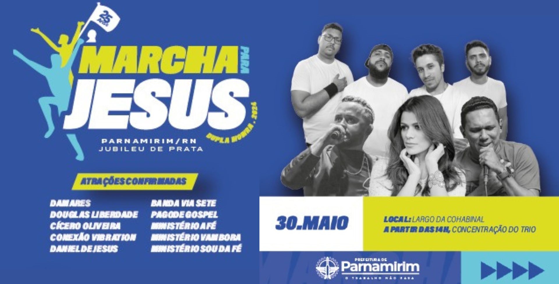A Prefeitura de Parnamirim, por meio das secretarias de Turismo e Desenvolvimento Econômico (Setude) e de Cultura (Semuc), convida toda a comunidade para a 25ª edição da Marcha para Jesus, um dos eventos mais importantes para a comunidade evangélica da cidade. O evento ocorrerá no dia 30 de maio, a partir das 14h, no Largo da Cohabinal.