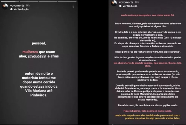 Uma passageira relatou nas redes sociais nesta quarta-feira (11) que foi dopada por um motorista de transporte por aplicativo com um produto químico lançado no ar dentro do carro, durante corrida na noite desta terça-feira (10). Em nota, a 99 afirmou que bloqueou o motorista e mobilizou uma equipe para dar suporte à passageira.
