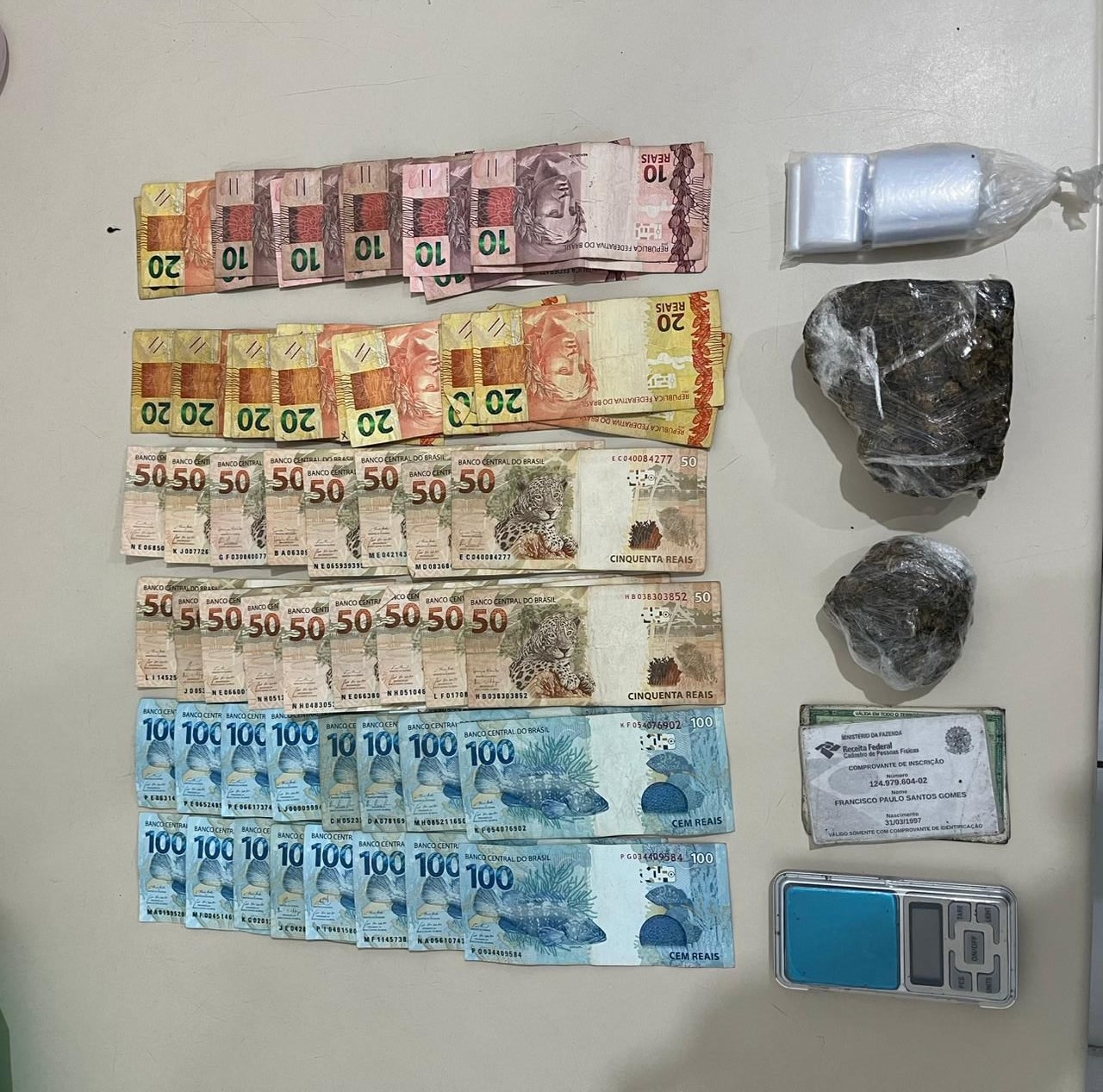 Com o suspeito, foram apreendidos R$ 2.900 em dinheiro fracionado, duas porções grandes de substância esverdeada semelhante à maconha, uma balança de precisão e embalagens plásticas utilizadas para acondicionamento de entorpecentes. O homem foi detido e encaminhado à unidade policial.