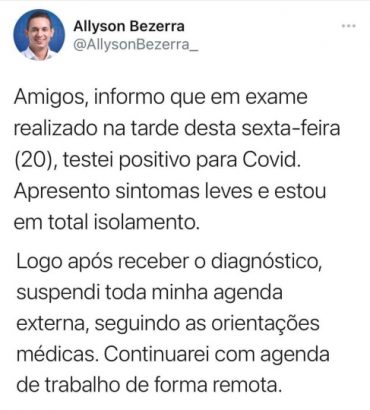 Cinco dias após as eleições o prefeito eleito em Mossoró, Allyson Bezerra, anuncia que está com Covid-19.