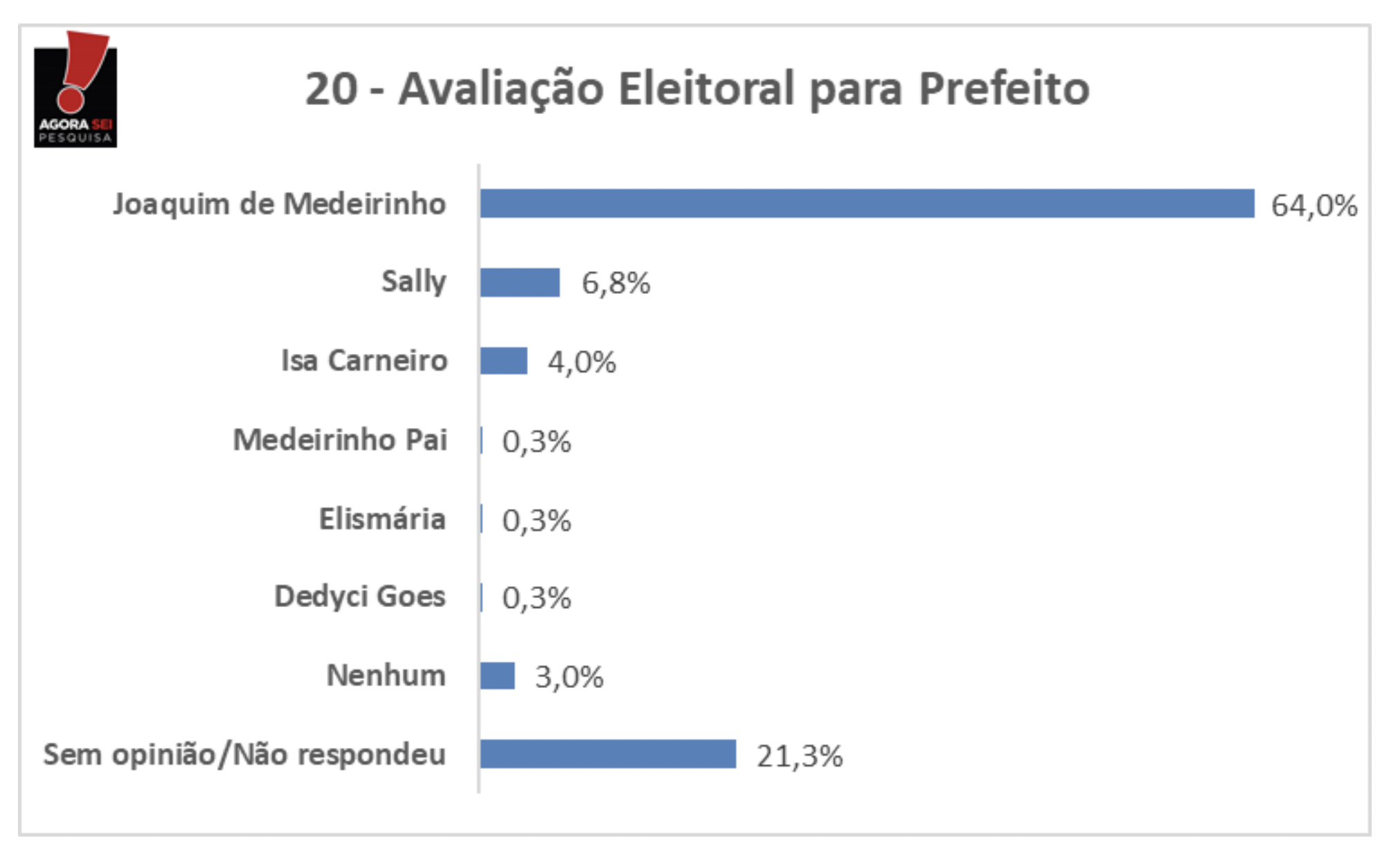 Numa possível corrida ao executivo do município, Elismária chegaria a 5,8%, a ex-vice-prefeita Isa Carneiro teria 3,3% e a primeira dama Ariluzia de Joaquim de Medeirinho apareceria com 1,8%