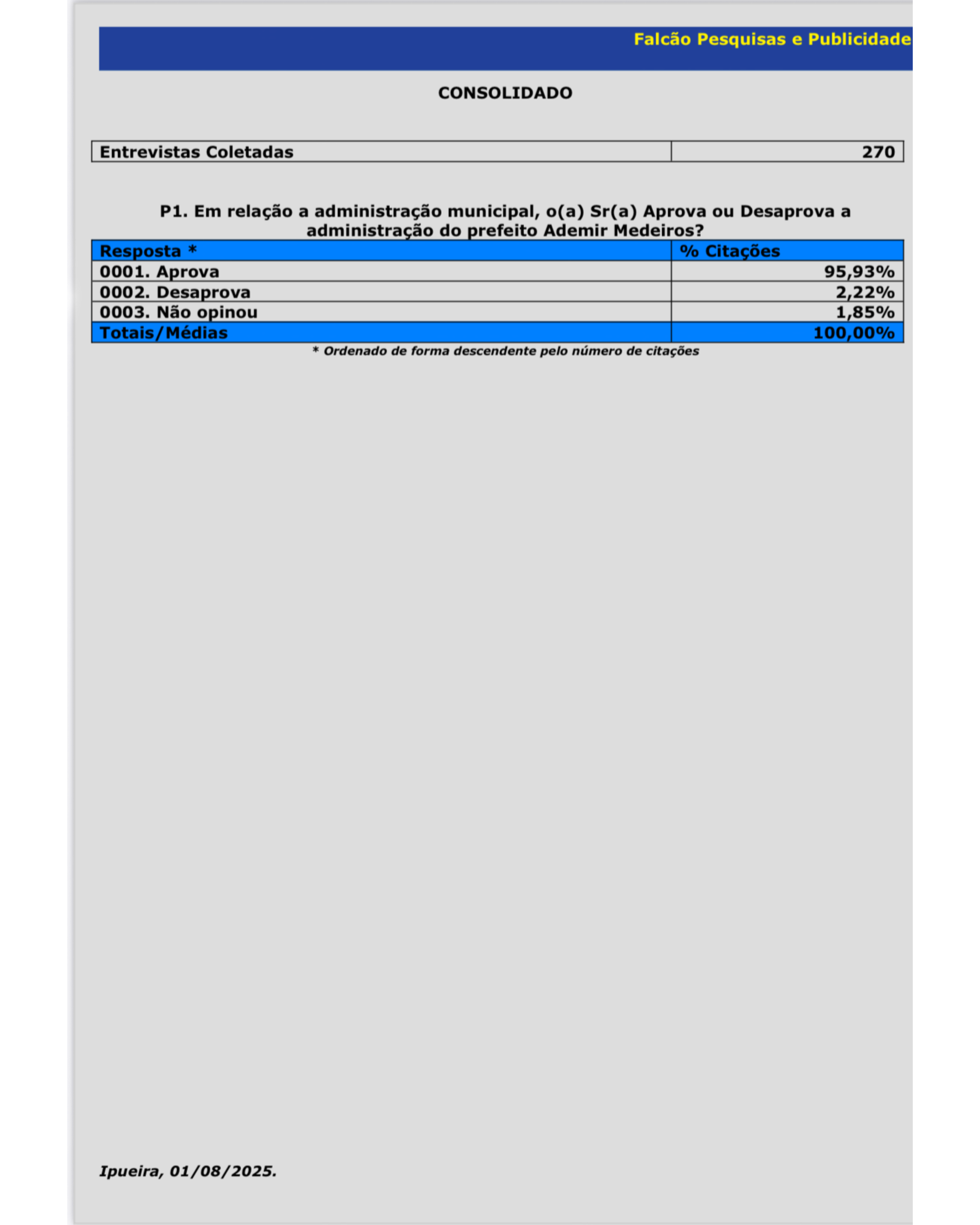 Uma pesquisa realizada pelo Instituto Falcão Publicidade, da cidade de Patos ( PB) revelou um resultado expressivo sobre a administração municipal de Ipueira: a gestão do prefeito Ademir de Medeiros alcançou 95,93% de aprovação entre os eleitores do município.