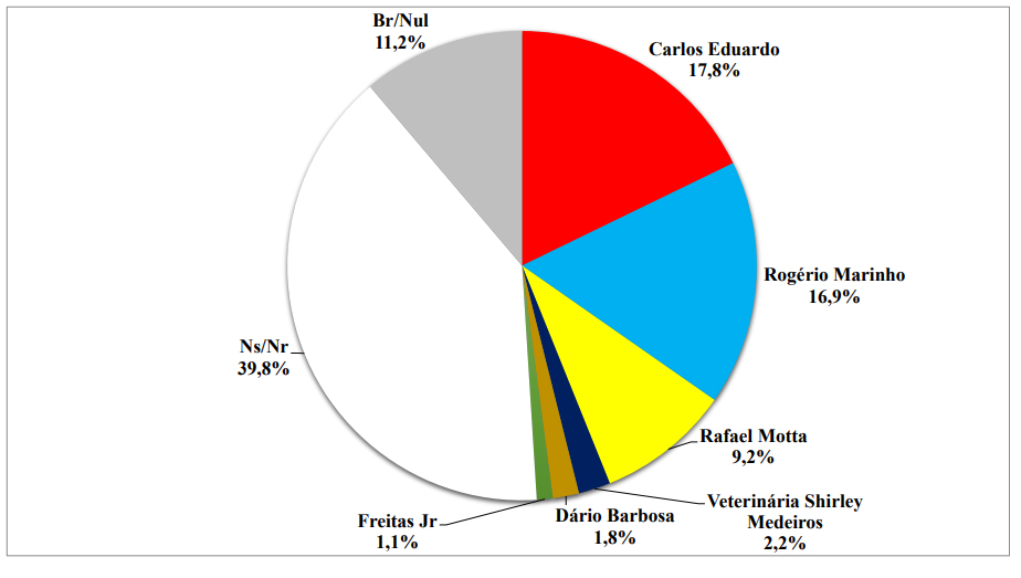Em terceiro aparece o deputado federal Rafael Motta com 9,2% das intenções de voto. Os demais candidatos não atingiram a margem de erro da pesquisa. Os indecisos corresponderam a 39,8% do eleitorado.