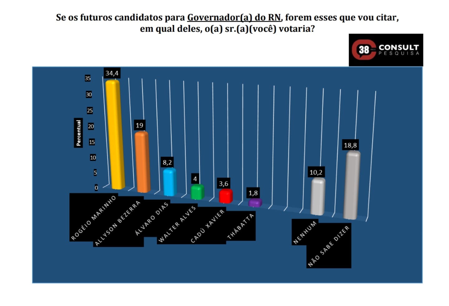 O líder da oposição no Senado aparece com 34,4% das intenções de votos para o executivo estadual, seguido pelo prefeito de Mossoró, Allyson Bezerra (Uniã) com 19% e o ex-prefeito de Natal, Álvaro Dias (Republicanos), com 8,2%. Neste cenário, o quarto mais citado é o atual vice-governador Walter Alves (MDB) com 4%, enquanto Cadu Xavier tem 3,6% e Thábatta Pimenta (Psol) 1,8%. Outros 10,2% não citaram nenhum e 18,8% não soube dizer.