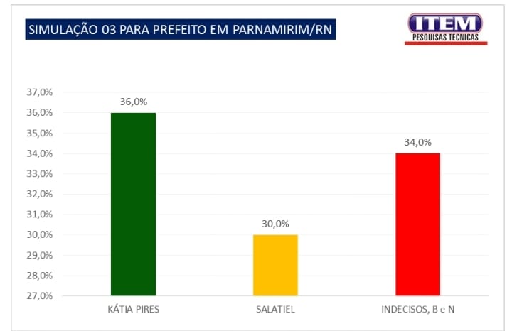 Em mais um levantamento feito pela ITEM, a pedido do blog Jair Sampaio, Parnamirim mostrou sua vontade quando à corrida eleitoral desse ano, mostrando o confronto direto se as eleições fossem hoje, entre a pré candidata Kátia Pires (UB) e Salatiel de Souza(PL). A pesquisa ouviu 600 pessoas entre os dias 18 e 19 de maio, e está registrada sob o número RN 03004/2024.