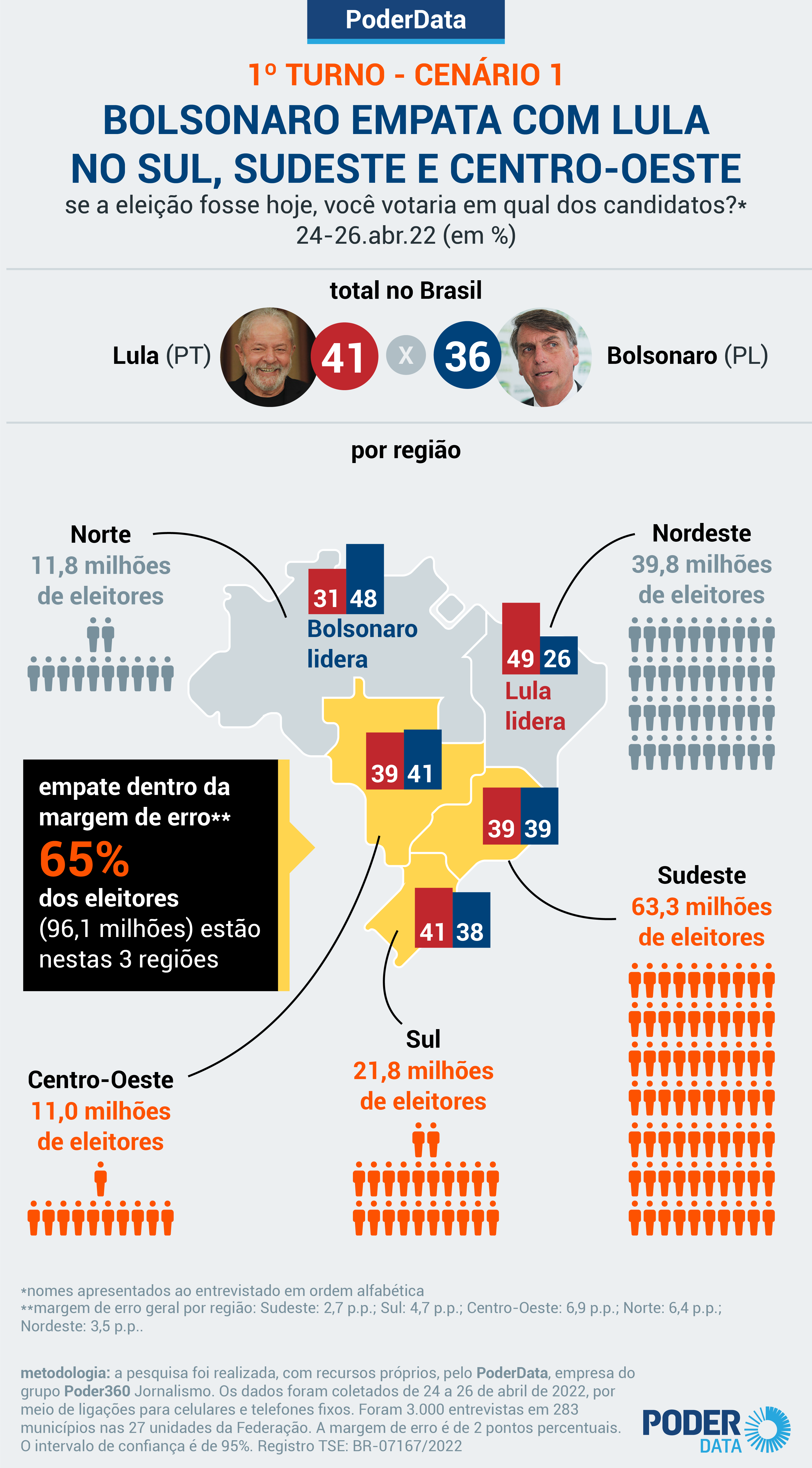 A pesquisa mostra ainda que Lula e Bolsonaro empatam em três das cinco regiões do país: Sudeste, Sul e Centro-Oeste. As três concentram 65% dos eleitores brasileiros, o equivalente a 96,1 milhões de pessoas. No Sudeste, região na qual estão 63,3 milhões de eleitores, ambos aparecem com 39% das intenções de voto, ou sejam, empatados numericamente.