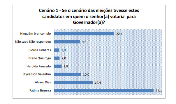 Em seguida aparecem o prefeito Álvaro Dias com 14,4% e o senador Styvenson Valentim com 10%. O empresário Haroldo Azevedo ainda foi citado por 2,8%, acima da margem de erro amostral da pesquisa. Brancos e nulos somaram 22,4%. Os indecisos corresponderam a 9,6%.