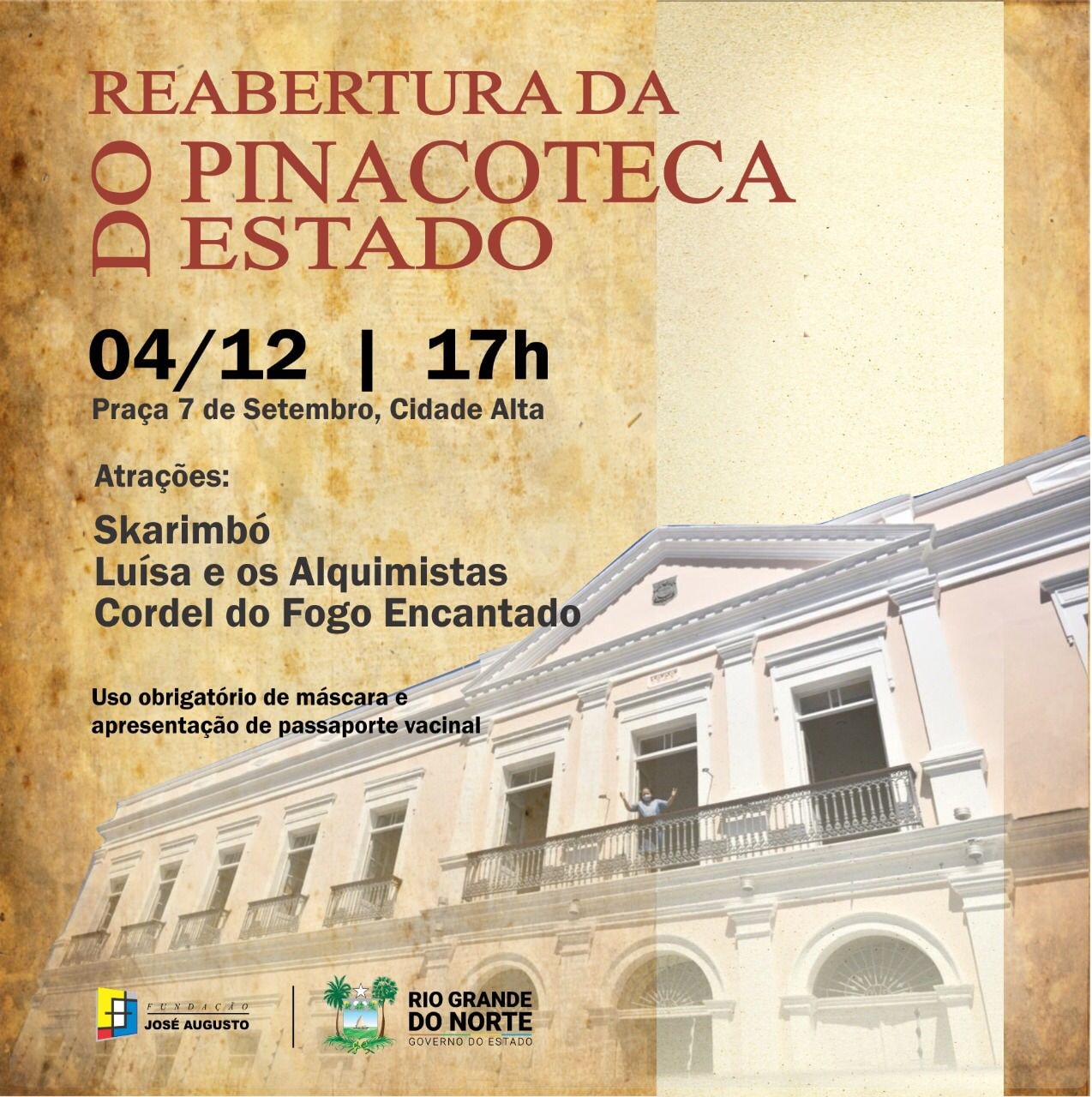 Artes visuais e música celebram neste sábado (4/12), restaurado, o prédio da Pinacoteca do Estado (antigo Palácio Potengi e sede do Governo), localizado no bairro da Cidade Alta, em Natal. O equipamento cultural, administrado pela Fundação José Augusto (FJA) que reúne a mais relevante produção potiguar de artes plásticas foi recuperado pelo Governo do RN com recursos de R$ 6,4 milhões através do Governo Cidadão e Secretaria Estadual de Turismo (Setur), via acordo de empréstimo com o Banco Mundial.