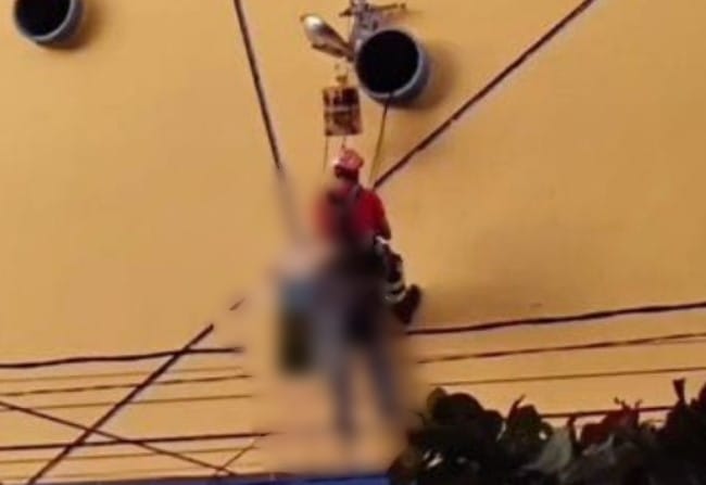 O homem ficou pendurado pelo equipamento de segurança e foi necessário que uma equipe do Corpo de Bombeiros retirasse o corpo do local.