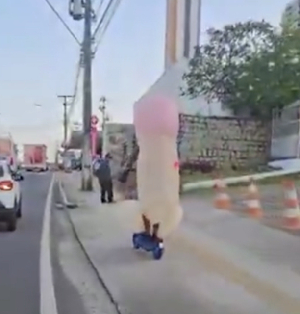 Nas redes sociais, um vídeo recente chamou atenção ao mostrar um homem fantasiado de “piroka” circulando em um patinete pelas ruas da capital potiguar. A cena gerou espanto, muitas risadas e levantou a suspeita de ser parte de uma campanha publicitária ousada de uma empresa, que apostou no humor para chamar atenção.