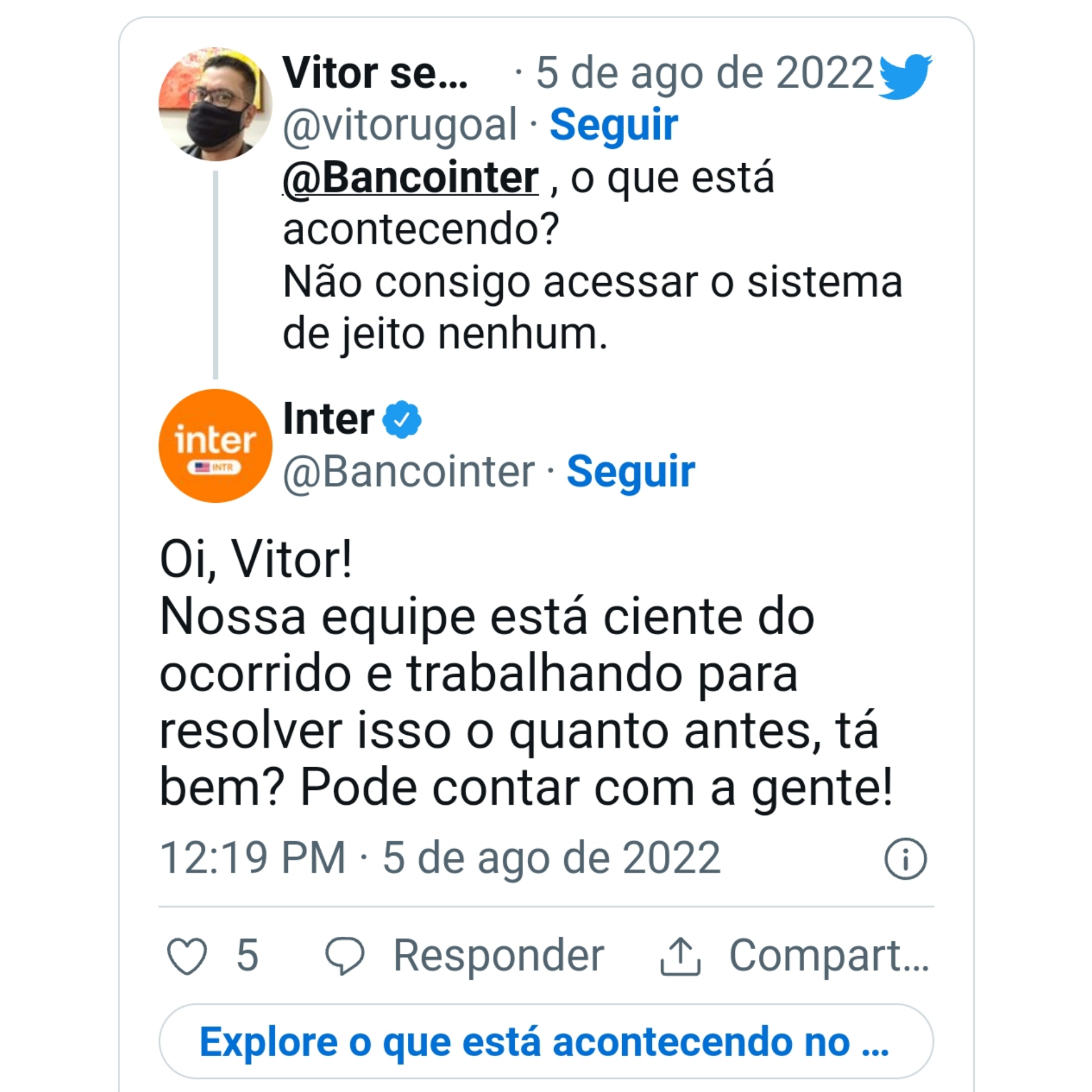 As empresas confirmaram no Twitter as dificuldades quando questionadas pelos usuários afetados. O Banco Inter se manifestou afirmando que a “equipe estava ciente do ocorrido e trabalhando para resolver isso o quanto antes”.