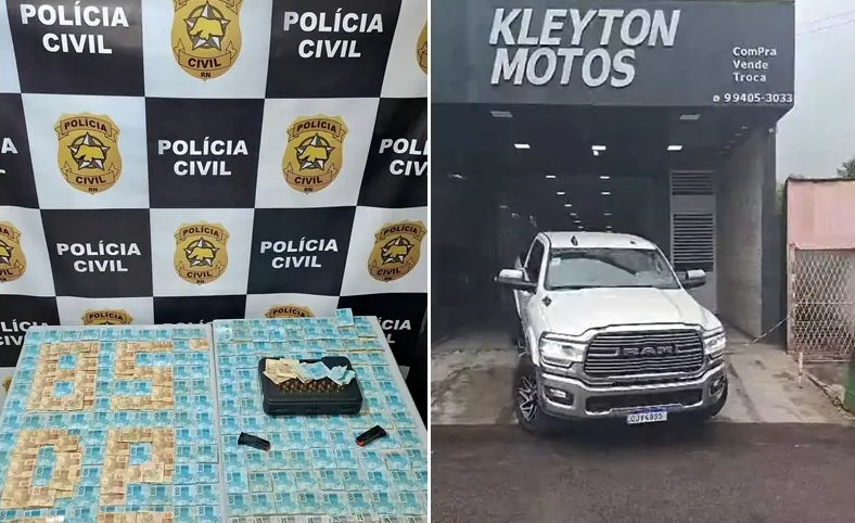 Depois do homicídio, mandados foram cumpridos também na loja de Everton Cleiton. No local, os investigadores encontraram motocicletas com sinais de adulteração e veículos de luxo, além de anotações. Tudo foi apreendido.