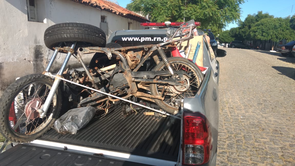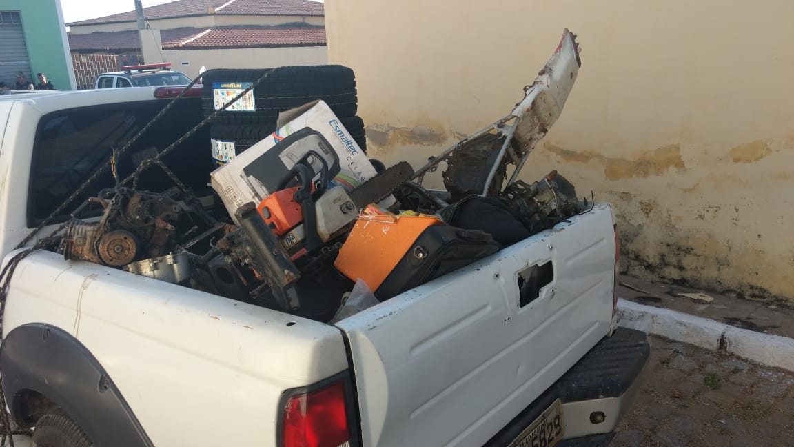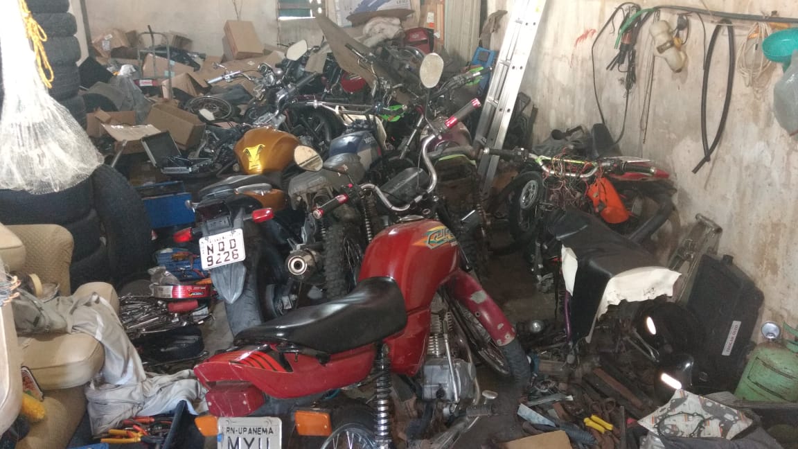 Com JOSÉ GEOVANE BANDEIRA, em uma oficina mecânica de sua propriedade, foram apreendidos várias peças de veículos, quadros de motocicletas, peças de som automotivo, notebooks e outros objetos, que denotam a existência de um desmanche.