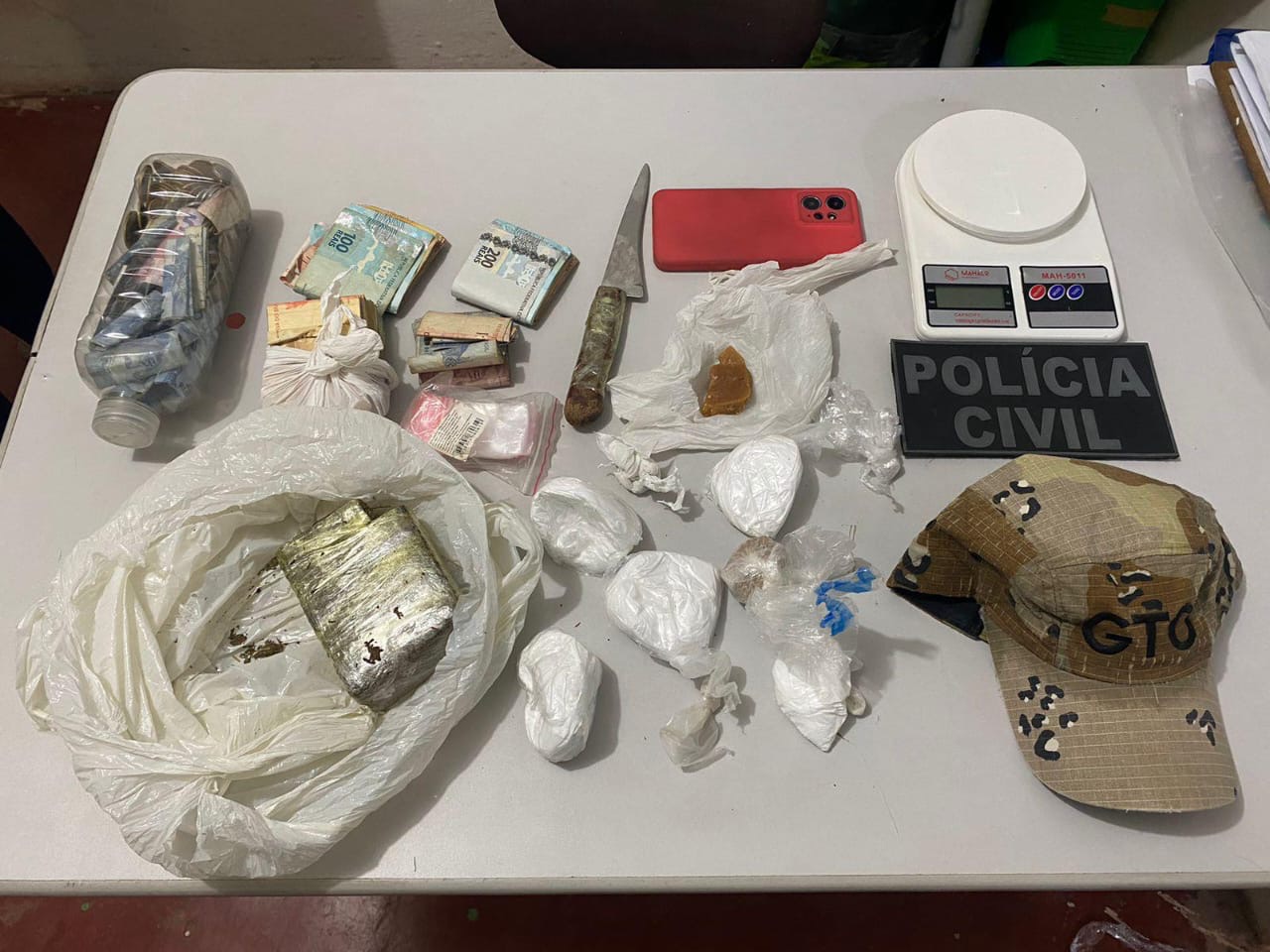 No local, foram apreendidos tabletes de maconha, pedras de “crack”, cerca de meio quilo de cocaína, apetrechos para acolhimento da droga, uma balança de precisão e mais de R$ 5.000,00 (cinco mil reais) em dinheiro.